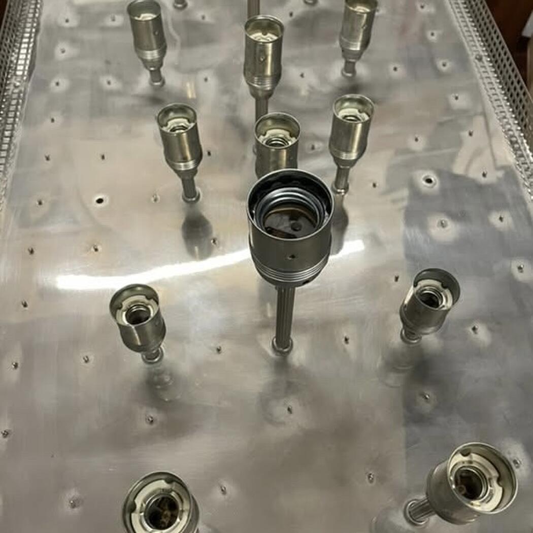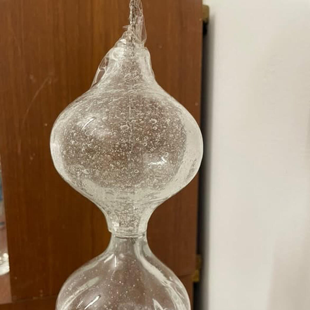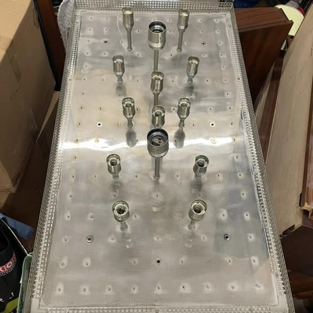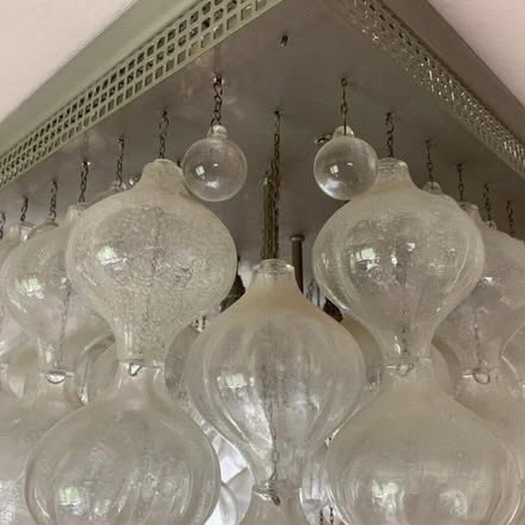 Tolle große Deckenleuchte, Tulipan Pyramide, Deckenplatte vernickelt, Nickelketten und Blasenglas. Kalmar Österreich 1970er Jahre.