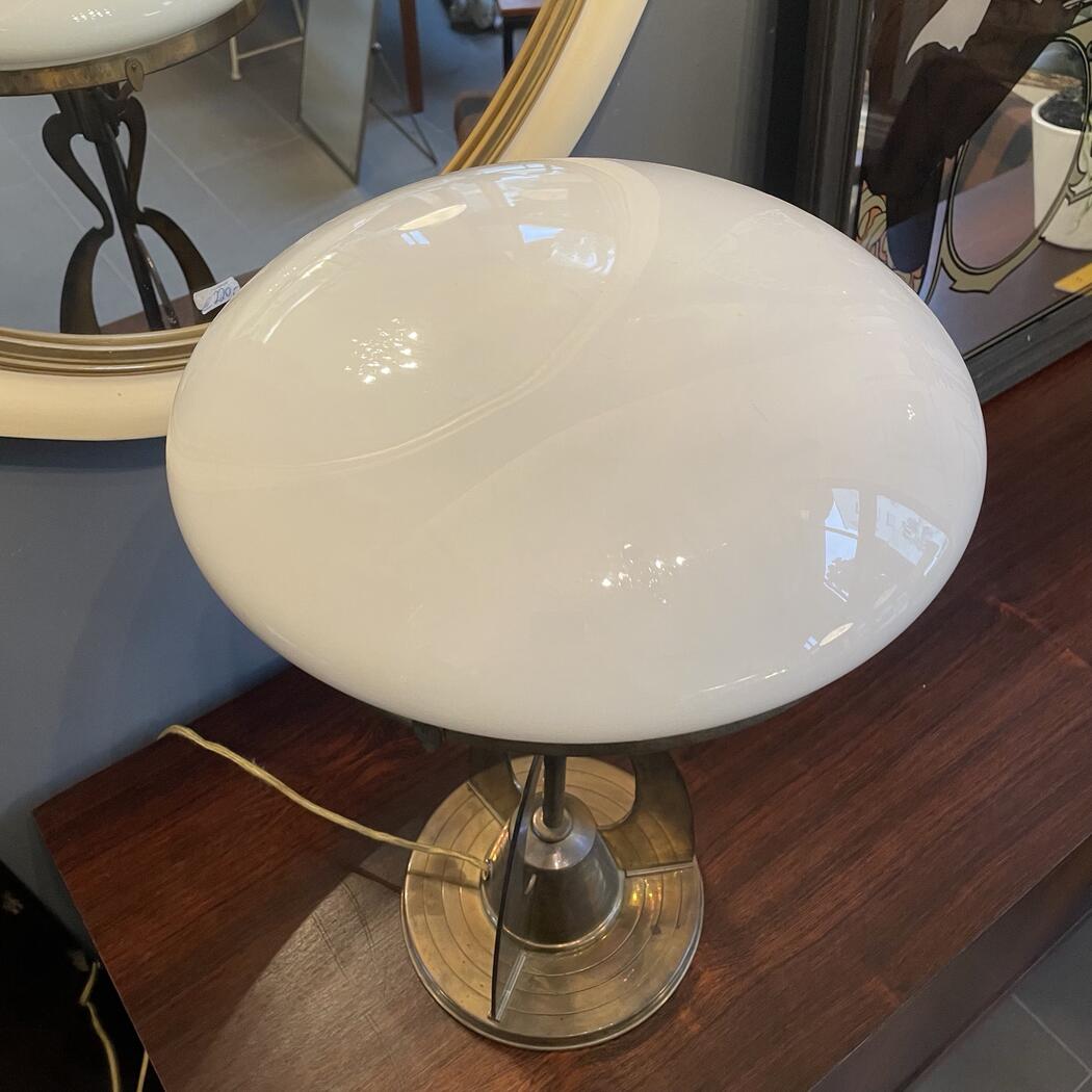 Jugendstil Tischlampe, Anfang 20. Jahrhundert, Messinggestell mit rundem Stand und weißem Glasschirm, schöner Zustand.