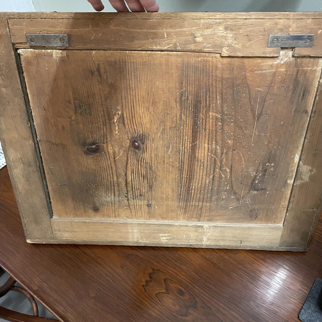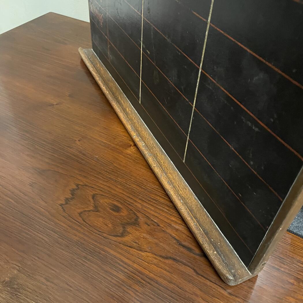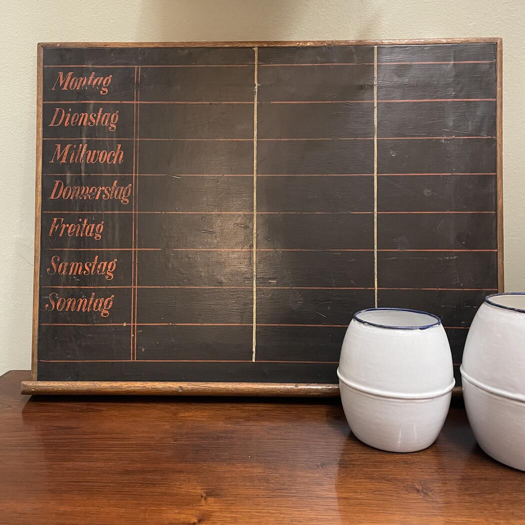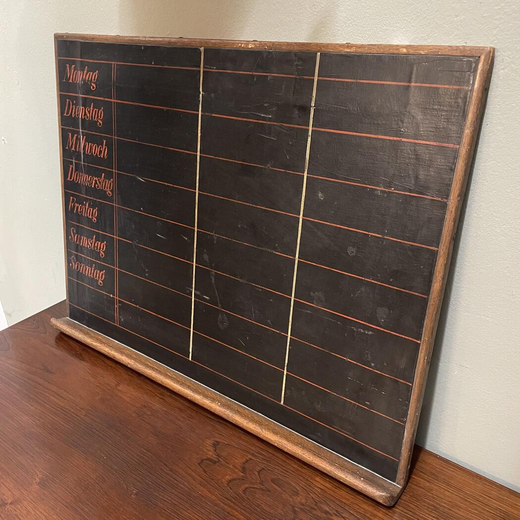 Auf einen Holzrahmen aufgezogene Tafel mit vorgedruckten Wochentagen. Ablage für Kreide. Aufhängung für Wandmontage. Schöner vintage Zustand.