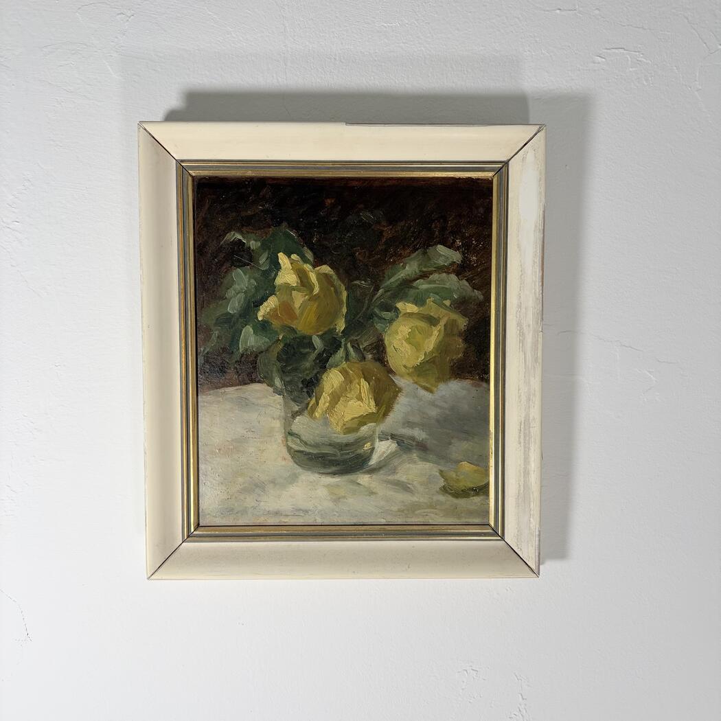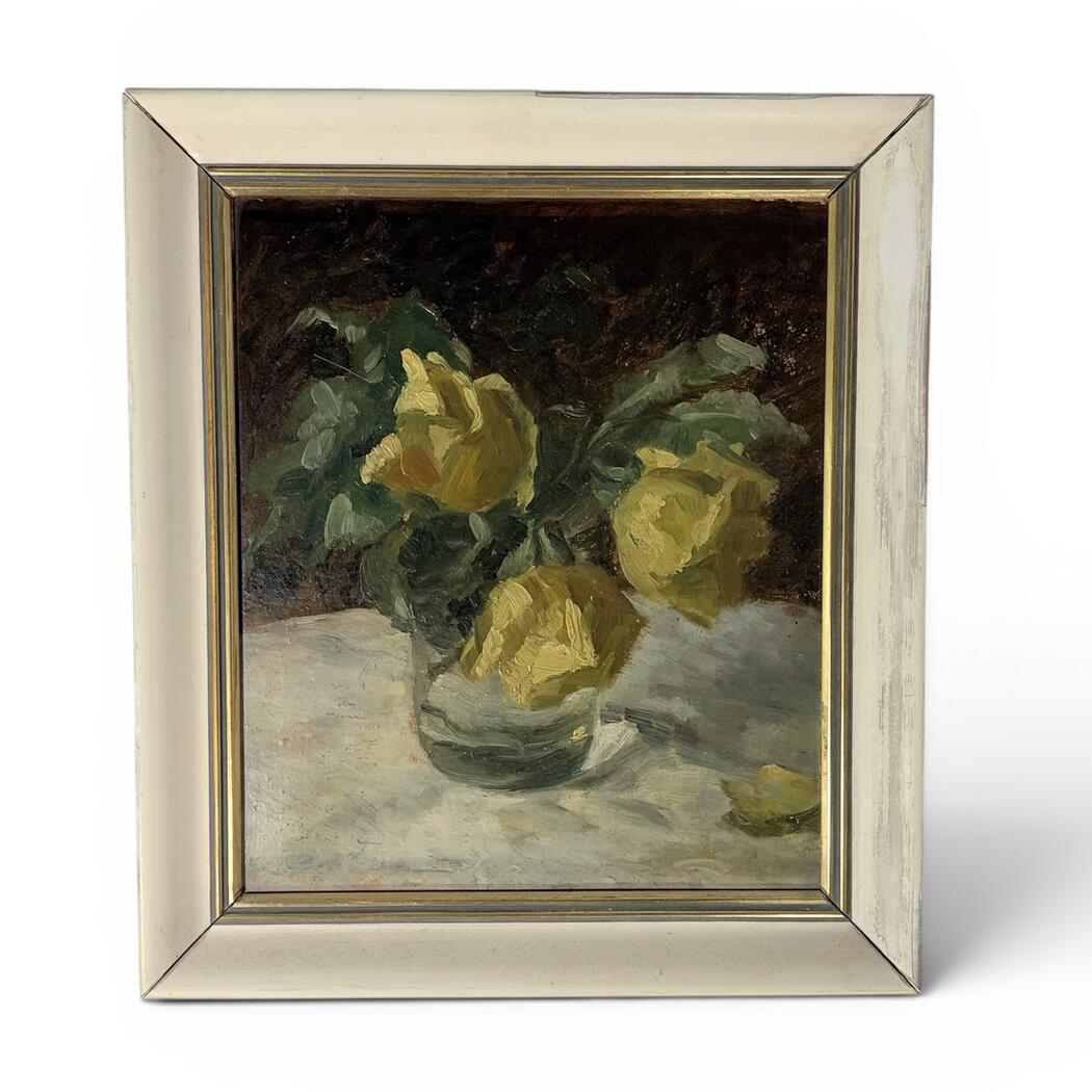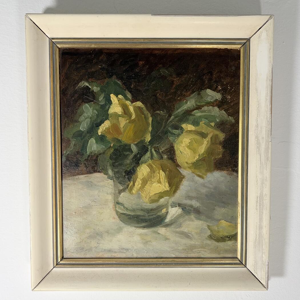 Kleines Gemälde eines Blumenstraußes. Öl auf Karton. Gerahmt. Signaturnicht lesbar.