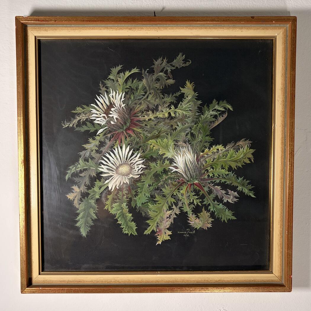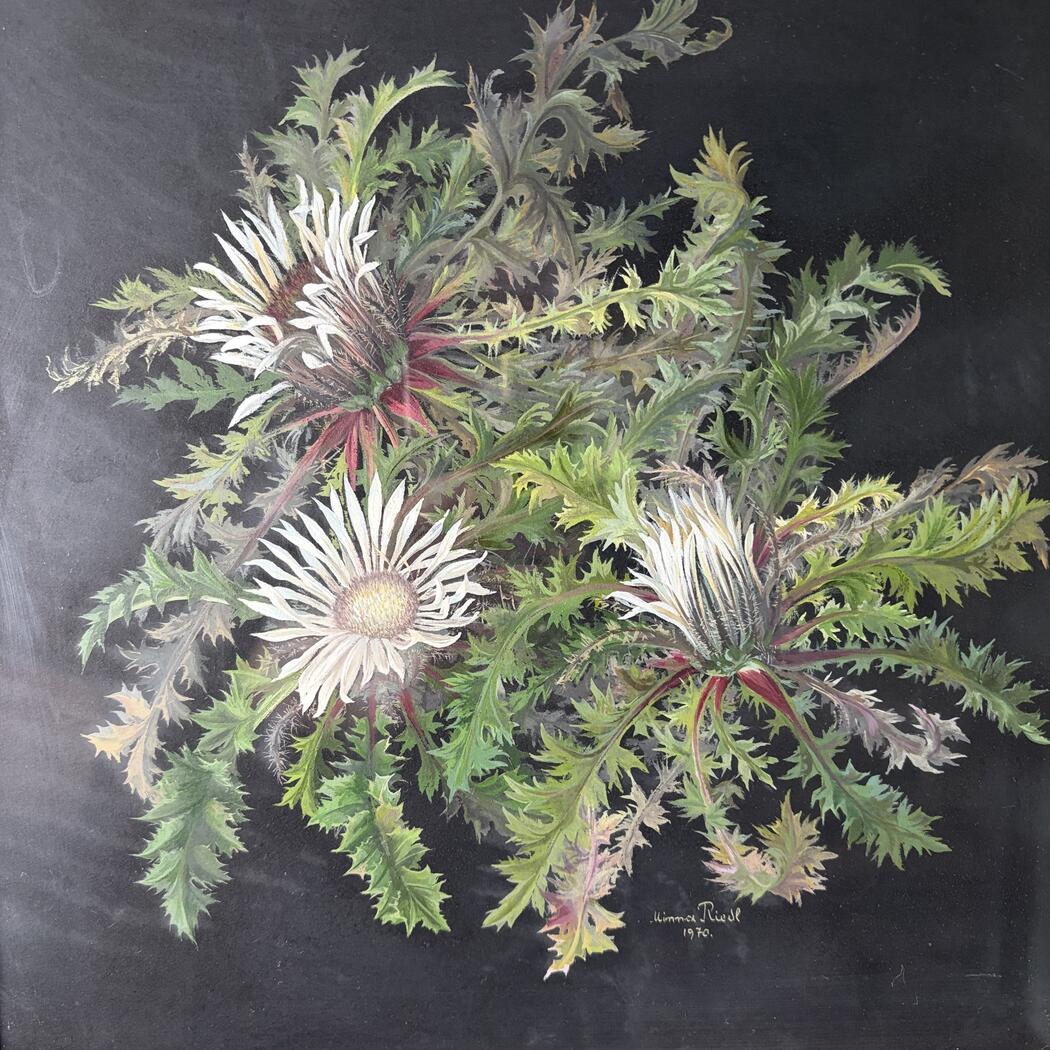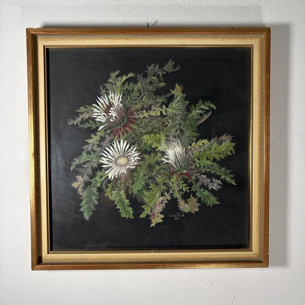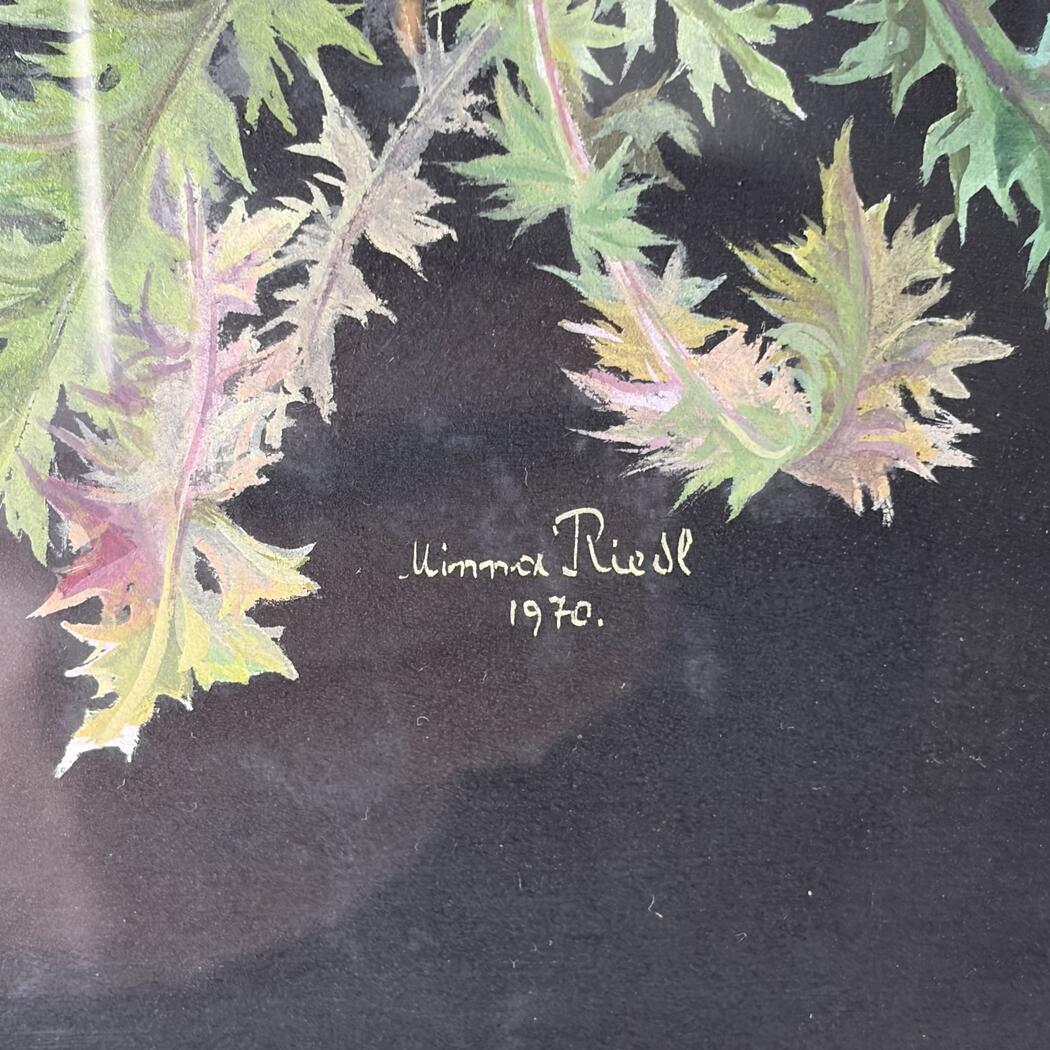 Beeindruckendes Gemälde einer Silberdistel. Gouache auf schwarzem Papier. Signiert Minna Riedel 1970, gerahmt.
